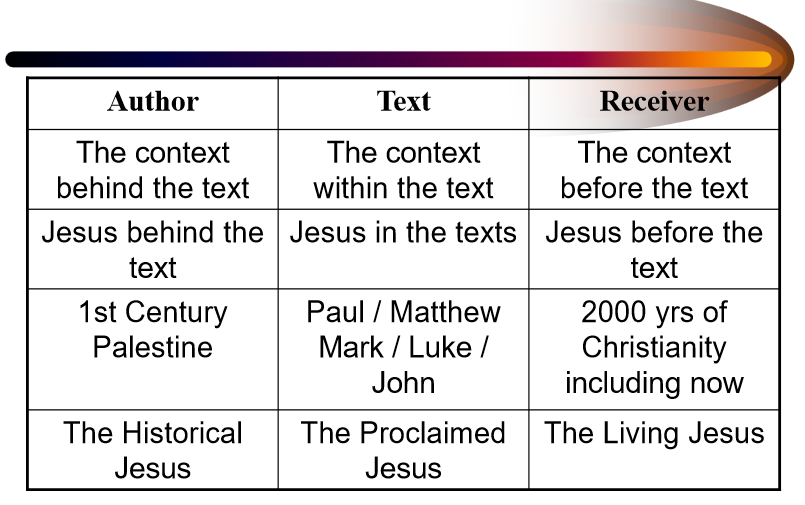 - The Jesus witnessed to in the New Testament and later doctrinal interpretations of his life, death and resurrection, and his meaning for their communities